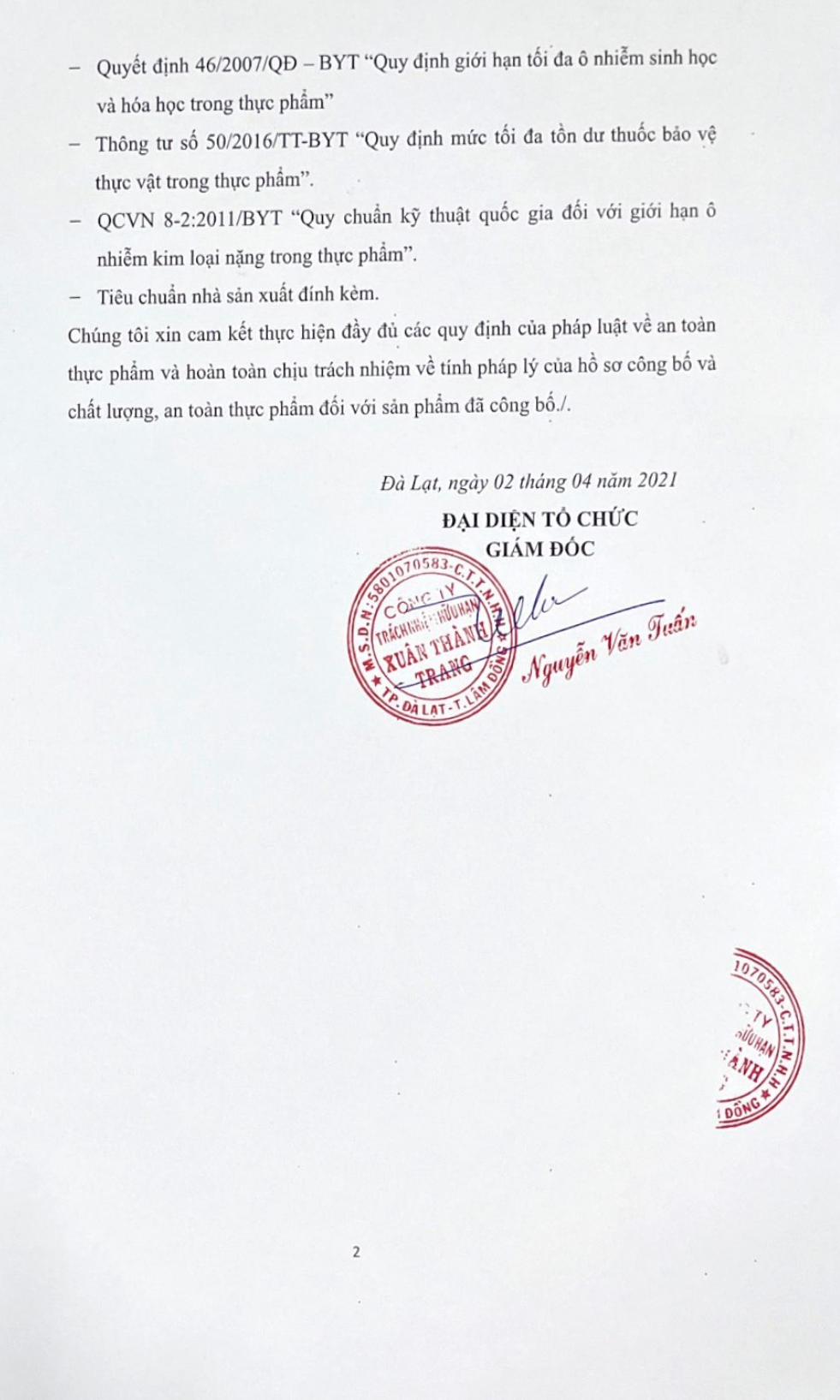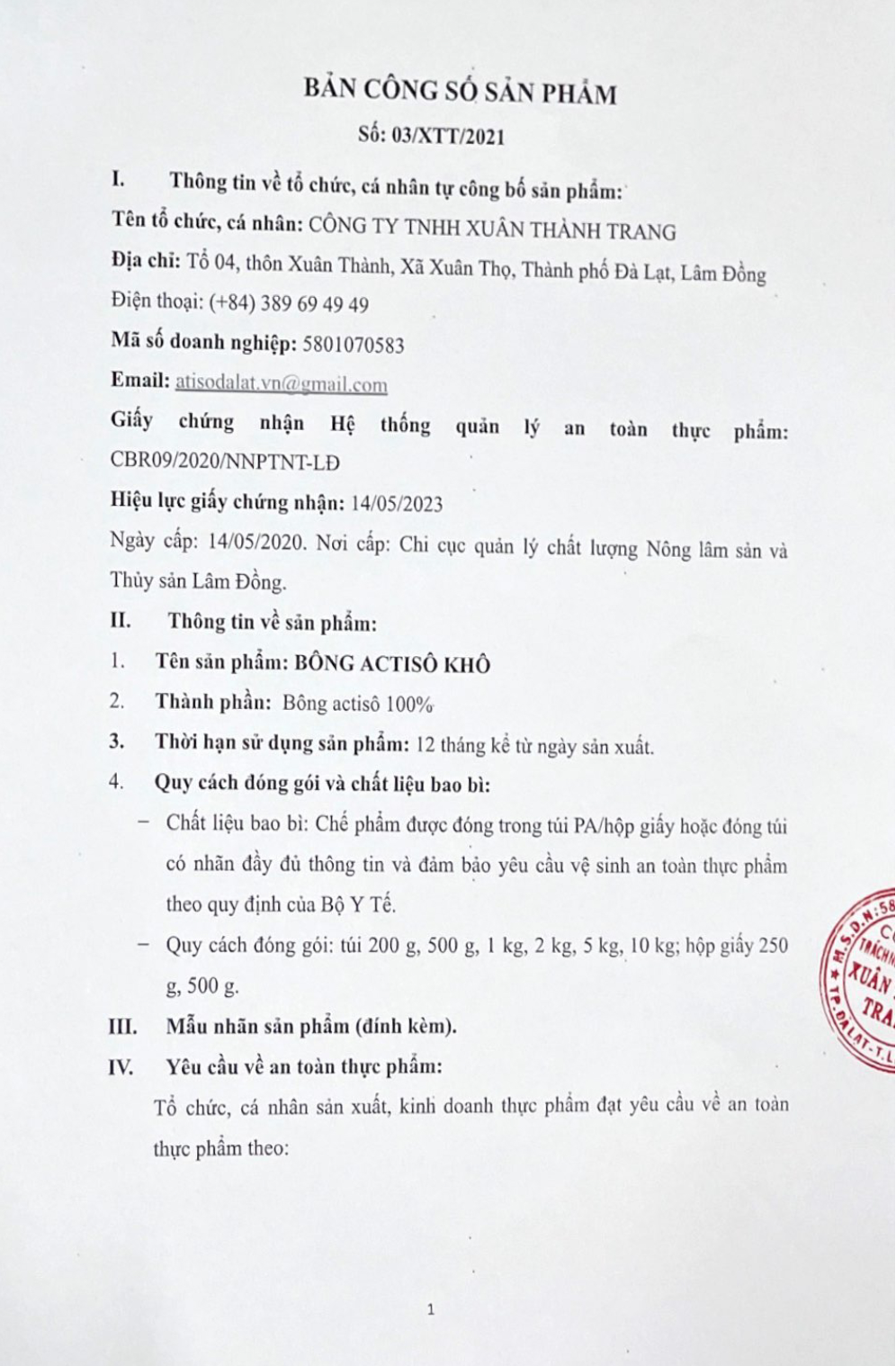 BẢN TỰ CÔNG BỐ SẢN PHẨM BÔNG ACTISÔ KHÔ